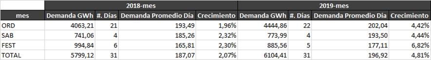 Es importante tener en cuenta que los crecimientos de la demanda de energía se calculan como el promedio ponderado de los crecimientos de los diferentes tipos de días (comerciales, sábados, domingos y festivos). Este tipo de cálculo disminuye las fluctuaciones que se presentan en los seguimientos mensuales, originados por la dependencia del consumo de energía en relación con el número de días presentados en el mes de análisis.