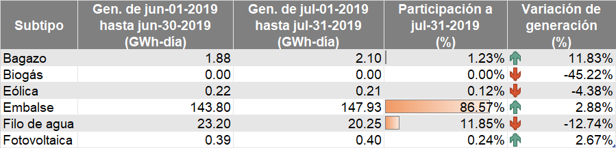 Con corte al 9 de agosto de 2019, el 87.79% de la generación, equivalente a 170.89 GWh-día promedio, fue producto de recursos renovables; el 12.21% restante, equivalente a 23.77 GWh-día promedio, fue de recursos no renovables. Comparado con el mes anterior, la variación de la generación no renovable fue de un 6.07%, mientras que la renovable fue de un 0.83%.