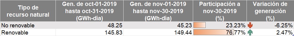 El 76.77% de la generación, equivalente a 149.4 GWh-día promedio, fue producto de recursos renovables; el 23.23% restante, equivalente a 45.2 GWh-día promedio, fue de recursos no renovables. Comparado con el mes anterior, la variación de la generación no renovable fue de un 23.23%, mientras que la renovable fue de un 76.77%.
