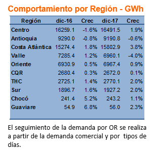 Por nueve meses consecutivos en Colombia ha crecido el consumo de energía. En 2017 las zonas de mayor crecimiento en el consumo fueron: Costa Atlántica 3.8% y Guaviare 2.3%. Ver tabla 1.