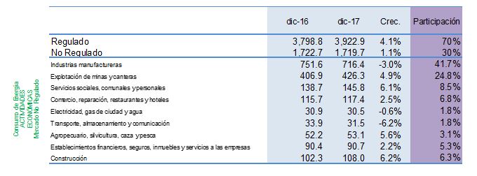 Si analizamos solo diciembre de 2017, vemos que se presentó un crecimiento en el consumo (demanda) de energía de 3.2% con respecto al mismo mes de 2016. Discriminando por tipo de consumidor, se presentó un crecimiento de 4.1%, en el consumo residencial y pequeños negocios (mercado regulado). Por su parte, el consumo de la industria y comercio (mercado no regulado) creció 1.1%. Ver tabla 2.