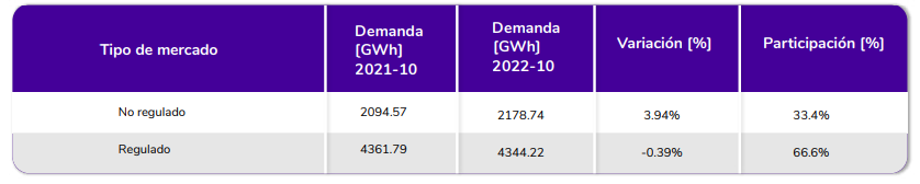 La demanda de energía eléctrica en el mes de octubre de 2022 aumentó un 1,03% con respecto al mismo mes de 2021.