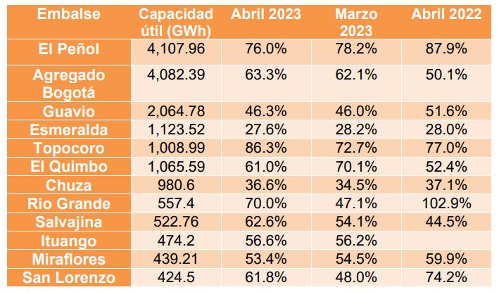 En abril el nivel agregado de los embalses de generación de energía eléctrica se ubicó en un 62.11% del volumen útil, 2.23 puntos por encima del nivel reportado al cierre de marzo de 2023 (59,88%) y 1.86 puntos por debajo del mismo mes del año 2022 (63.97%). Por su parte, los aportes del mes de abril se ubicaron en 113.6% por encima de la media histórica. Al realizar el análisis por regiones hidrológicas, los embalses de Antioquia alcanzaron 71.2% de su volumen útil, seguido por Centro con 67.4%, Valle con 65.3% Caribe con 60.4% y Oriente con 39.0%.