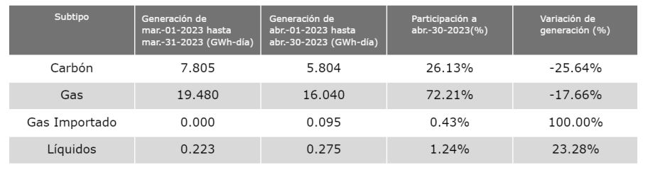 Por fuente de energía, la generación con gas representó un 72.21%, equivalente a 16.040 GWh-día promedio (17.66% menos con relación al mes anterior), seguido por el carbón con 4 un 26.13%, equivalente a 5.804 GWh-día promedio (25.64% menos con relación al mes anterior).