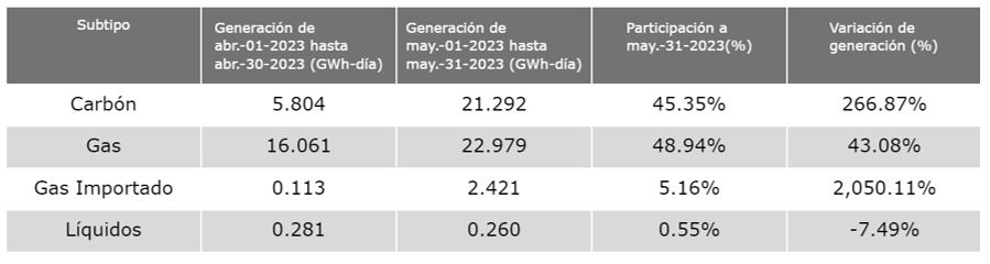 Por fuente de energía, la generación con gas representó un 48.94%, equivalente a 22.97 GWh-día promedio (43.08% más con relación al mes anterior), seguido por el carbón con un 45.35%, equivalente a 21.292 GWh-día promedio (266.87% más con relación al mes anterior).
