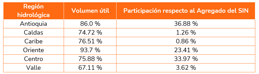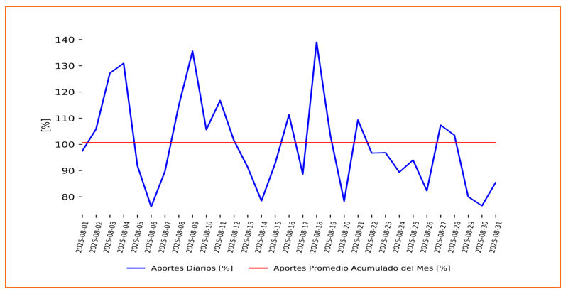 Los aportes hídricos cerraron agosto con un promedio acumulado del 100.14% (220.21 GWh-mes), ubicándolos por encima de la media histórica de dicho mes (219.9 GWh-mes). Los aportes hídricos por regiones fueron: Oriente con 84.03%, Valle con 103.02%, Centro con 120.11%, Antioquia con 102.84%, Caldas con 80.0% y Caribe con 81.55%.