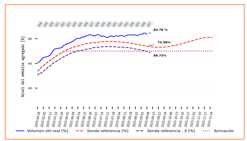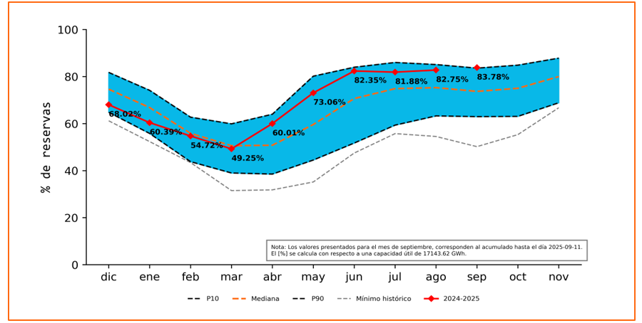Para el día 11 de septiembre, el nivel agregado del embalse del sistema se ubicó 9.8 (83.78 %) puntos por encima de la senda de referencia (73.98%) establecida por la CREG.