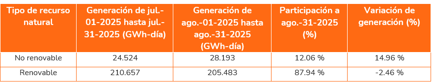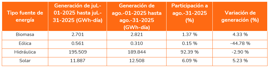 Con respecto a las Fuentes de Energía Renovables No Convencionales -FNCER- se tuvo que durante el mes de agosto del 2025 las plantas solares generaron en promedio 12.51 GWh-día, representando un 6.09% del total de la generación renovable (5.23% más respecto al mes de julio del 2025), mientras que las plantas eólicas aportaron un 0.15% de la generación renovable equivalente a 0.31 GWh-día (44.78% menos respecto a julio del 2025).