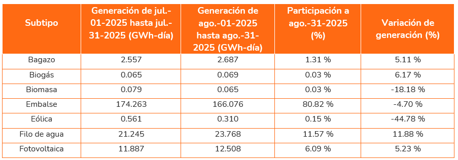 En total, en agosto se generaron 7,243.97 GWh. En promedio durante el mes, la generación de energía fue de 233.68 GWh-día, 0.64% menos comparado con la generación de julio de 2025 que fue de 235.18 GWh-día. (Se incluyen las exportaciones hacia Ecuador).