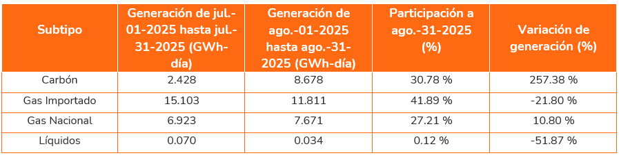 Por fuente de energía, la generación con carbón representó un 30.78%, equivalente a 8.68 GWh-día promedio (257.38% más con relación al mes anterior), el gas nacional con un 27.21%, equivalente a 7.67 GWh-día promedio (10.8% más con relación al mes anterior), el gas importado con una participación de 41.89%, equivalente a 11.81 GWh-día promedio (21.8% menos respecto al mes anterior).