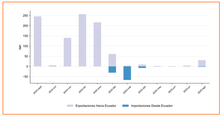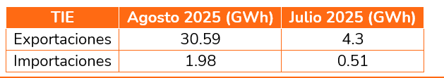 En el mes de agosto las Transacciones Internacionales de Electricidad, TIE, con Ecuador, Colombia importó 1.98 GWh, y exportó un total de 30.59 GWh, 610.67% por encima de los valores de exportación del mes anterior (4.3 GWh).