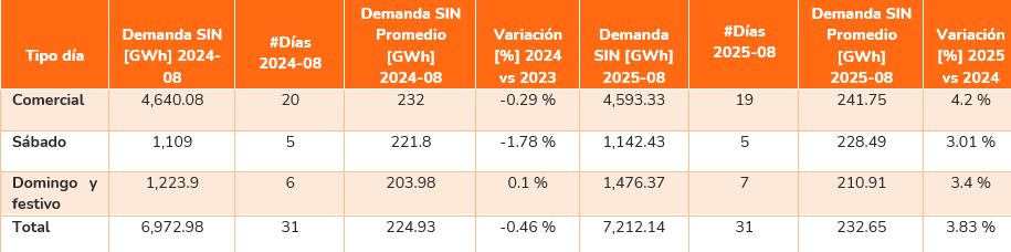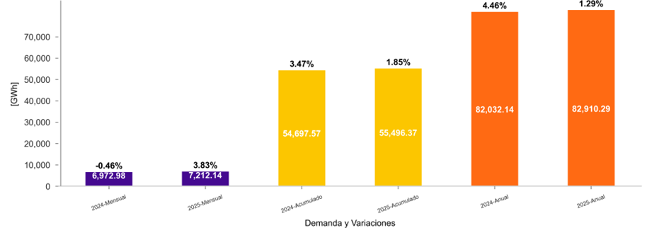 La demanda de energía eléctrica en agosto de 2025 aumentó 3.83 % respecto a agosto de 2024. Por otra parte, en lo que va acumulado del año 2025 y con corte al 31 de agosto, se tuvo un crecimiento de 1.85 % de la demanda de energía del SIN en comparación al mismo periodo de 2024.