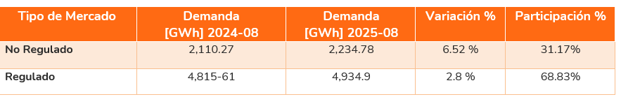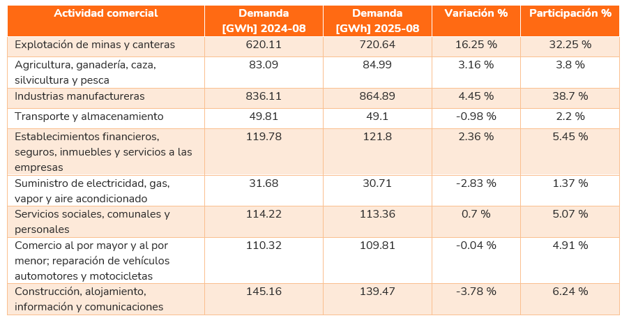 Dentro de las actividades económicas de mayor participación de demanda de energía en el mercado no regulado para agosto de 2025 respecto a agosto de 2024, se destacan: Industrias manufactureras con 864.89 GWh y Explotación de minas y canteras con 720.64 GWh, que representan un 38.7 % y 32.25 % de la demanda no regulada, respectivamente.