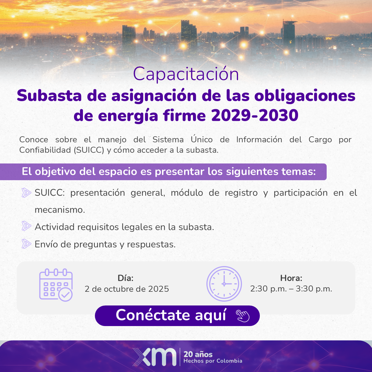 El próximo jueves 2 de octubre de 2025 entre las 2:30 y las 3:30 p.m. se realizará la Primera Capacitación de la Subasta del Cargo por Confiabilidad 2029-2030 convocada por la Resolución CREG 101 079 de 2025.