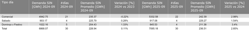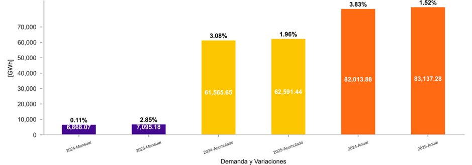 La demanda de energía eléctrica en septiembre de 2025 aumentó 2.85 % respecto a septiembre de 2024. Por otra parte, en lo que va acumulado del año 2025 y con corte al 30 de septiembre, se tuvo un crecimiento de 1.96 % de la demanda de energía del SIN en comparación al mismo periodo de 2024.