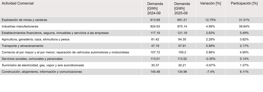 Dentro de las actividades económicas de mayor participación de demanda de energía en el mercado no regulado para septiembre de 2025 respecto a septiembre de 2024, se destacan: Industrias manufactureras con 875.14 GWh y Explotación de minas y canteras con 691.21 GWh, que representan un 39.64% y 31.31% de la demanda no regulada, respectivamente.