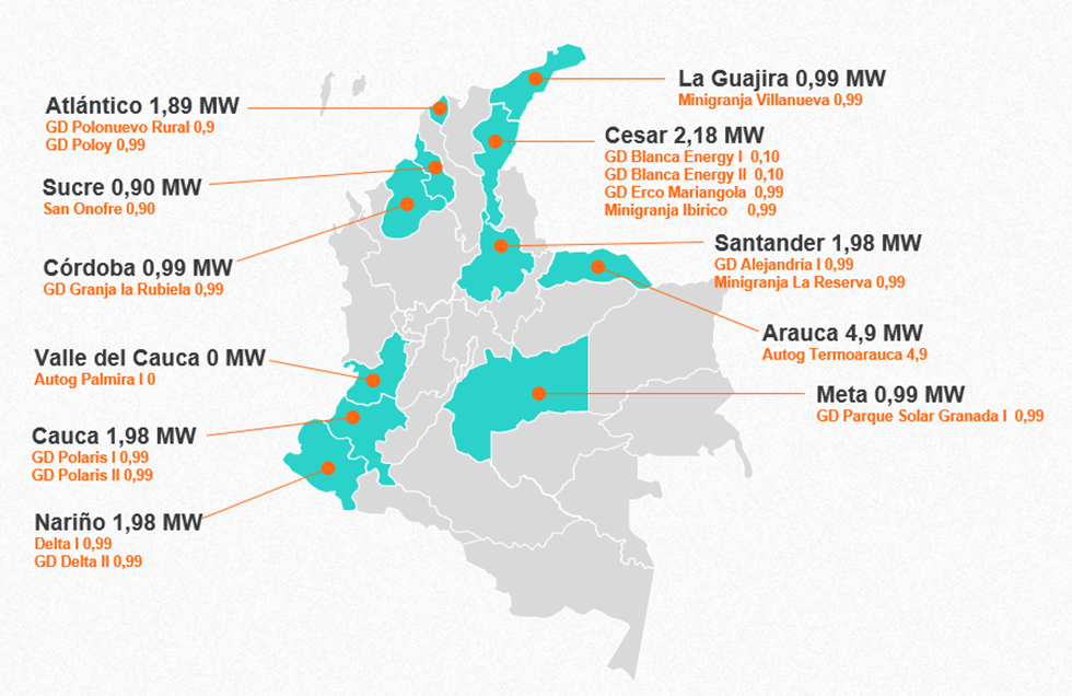 Al cierre del 30 de septiembre de 2025 se tenían 1.221,7 MW en 98 proyectos de generación aportando energía al Sistema Interconectado Nacional en estado de pruebas iniciales, es decir, conectados al Sistema para realizar las pruebas requeridas para su puesta en operación, en cumplimiento de la normativa vigente y los protocolos de pruebas definidos por el Consejo Nacional de Operación. De la totalidad de proyectos en pruebas, 66 de ellos correspondientes a 632,5 MW se encontraban en operación comercial durante el período de transición de las Resoluciones CREG 148 de 2021 y101 011 de 2022. En la siguiente imagen se detalla su ubicación.