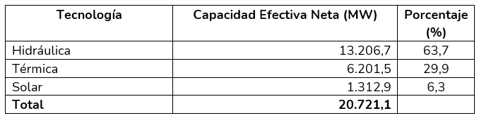 XM, en calidad de operador del sistema, continúa trabajando en la diversificación y transformación energética de la matriz de generación de energía eléctrica, la cual contó con una capacidad efectiva neta de 20.721 MW con corte al 30 septiembre de 2025, en donde el 6.3 % proviene de fuentes de energía solar. Adicionalmente, ingresaron al Sistema proyectos de generación que corresponden a plantas no despachadas centralmente con una capacidad efectiva neta menor a 20 MW, entre los que se encuentran autogeneradores a gran escala y generación distribuida.