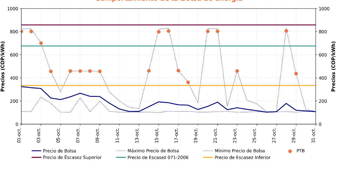 A partir de la Resolución CREG 101 066 de 2024, el mercado mayorista tiene tres precios de escasez: Precio de Escasez Inferior (PEI) de 334.17 COP/kWh; Precio de Escasez de la Resolución CREG 071 de 2006 (PE) de 675.82 COP/kWh, y el Precio de Escasez Superior (PES) de 857.21 COP/kWh para el mes de octubre.