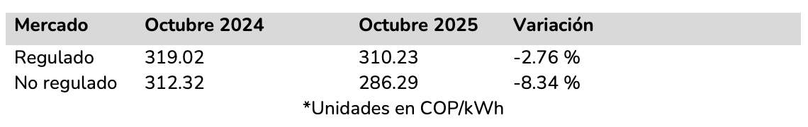 Durante octubre de 2025 el precio promedio de la energía transada en contratos para atender la demanda del consumo residencial y pequeños negocios (mercado regulado) fue de 310.23 COP/kWh, mientras que para la industria y el comercio (mercado no regulado), fue de 286.29 COP/kWh. Tanto el precio del mercado regulado como del no regulado presentaron una disminución de 0.50 % y 2.61 %, respectivamente con relación a los precios del mes de septiembre de 2025, que fueron de 311.79 COP/kWh y 293.95 COP/kWh.