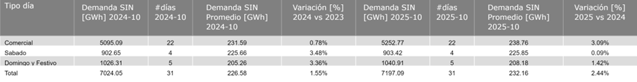 La demanda de energía eléctrica en octubre de 2025 aumentó 2.44 % respecto a octubre de 2024. Por otra parte, en lo que va acumulado del año 2025 y con corte al 31 de octubre, se tuvo un crecimiento del 2.01 % de la demanda de energía del SIN en comparación al mismo periodo de 2024.