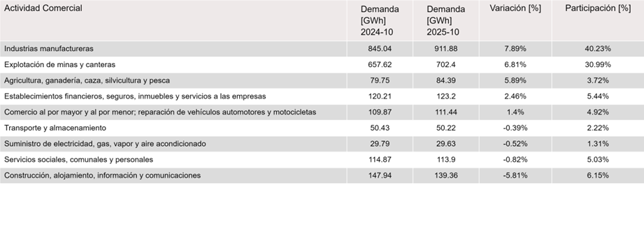 Dentro de las actividades económicas de mayor participación de demanda de energía en el mercado no regulado para octubre de 2025 respecto a octubre de 2024, se destacan: Industrias manufactureras con 911.88 GWh y Explotación de minas y canteras con 702.40 GWh, que representan un 40.23% y 30.99 % de la demanda no regulada, respectivamente.