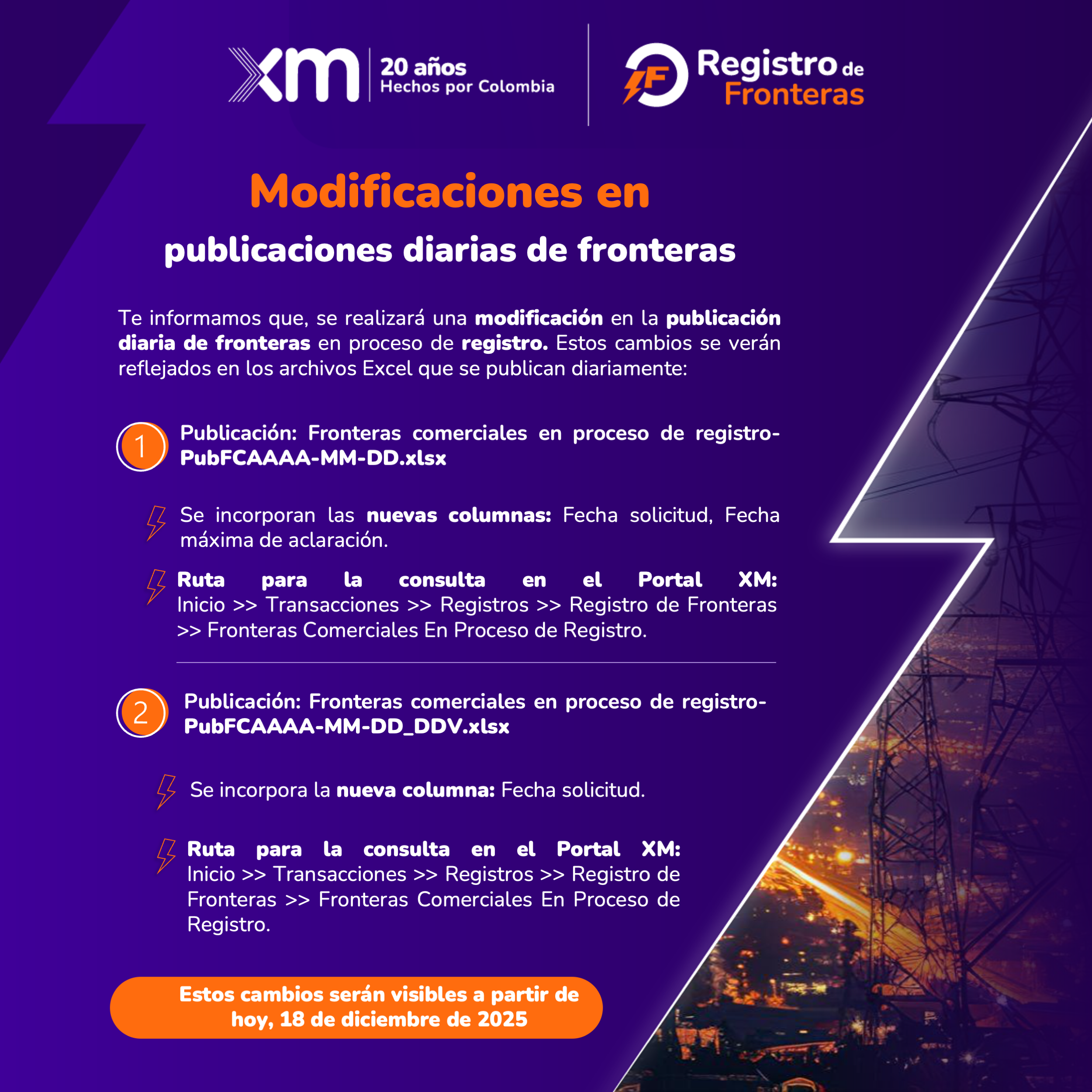 Modificaciones en publicaciones diarias de fronteras en proceso de registro