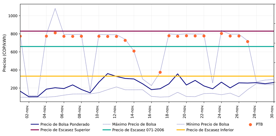 A continuación, se presenta el comportamiento de algunas variables de la bolsa de energía, contratos bilaterales y transacciones del MEM en noviembre de 2025.