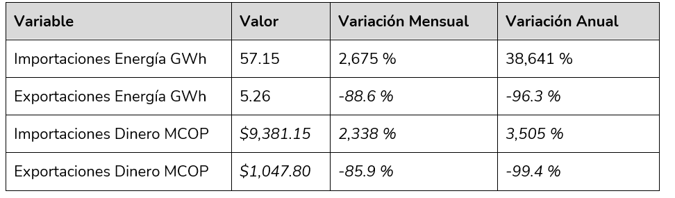- Las exportaciones de energía hacia Ecuador fueron de 5.26 GWh, 40.78 GWh menos que lo exportado el mes anterior, cuyo valor fue 46.05 GWh.