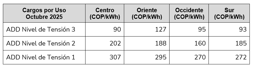 Los cargos por Áreas de Distribución (ADD) representan el costo asociado al uso de los sistemas de distribución, necesarios para llevar la energía eléctrica hasta el usuario final. El Ministerio de Minas y Energía estableció la creación de estas áreas con el propósito de unificar los cargos por uso de los usuarios que pertenezcan a una misma ADD, aun cuando hagan parte de diferentes mercados de comercialización.