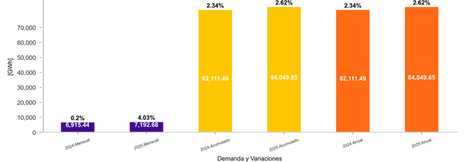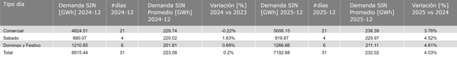 La demanda de energía eléctrica en diciembre de 2025 aumentó 4.03 % respecto a diciembre de 2024. Por otra parte, en lo que va acumulado del año 2025 y con corte al 31 de diciembre se tuvo un crecimiento del 2.62 % de la demanda de energía del SIN en comparación al mismo periodo de 2024.