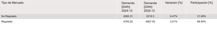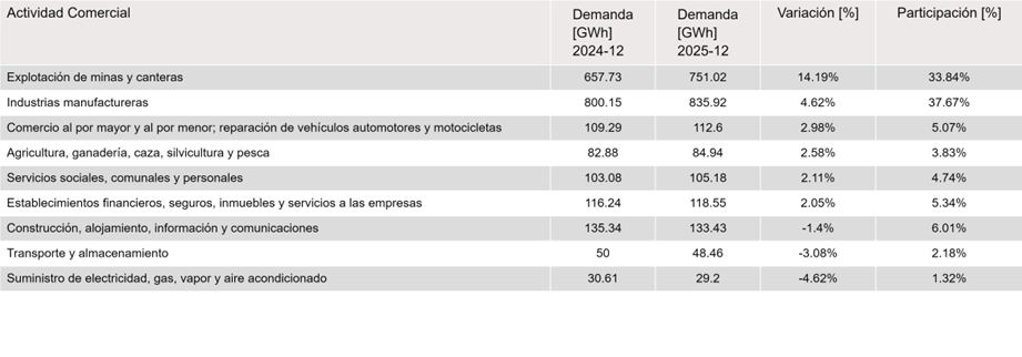 Dentro de las actividades económicas de mayor participación de demanda de energía en el mercado no regulado para diciembre de 2025 respecto a diciembre de 2024, se destacan: Industrias manufactureras con 835.92 GWh y Explotación de minas y canteras con 751.02 GWh, que representan un 37.67 % y 33.84 % de la demanda no regulada, respectivamente.