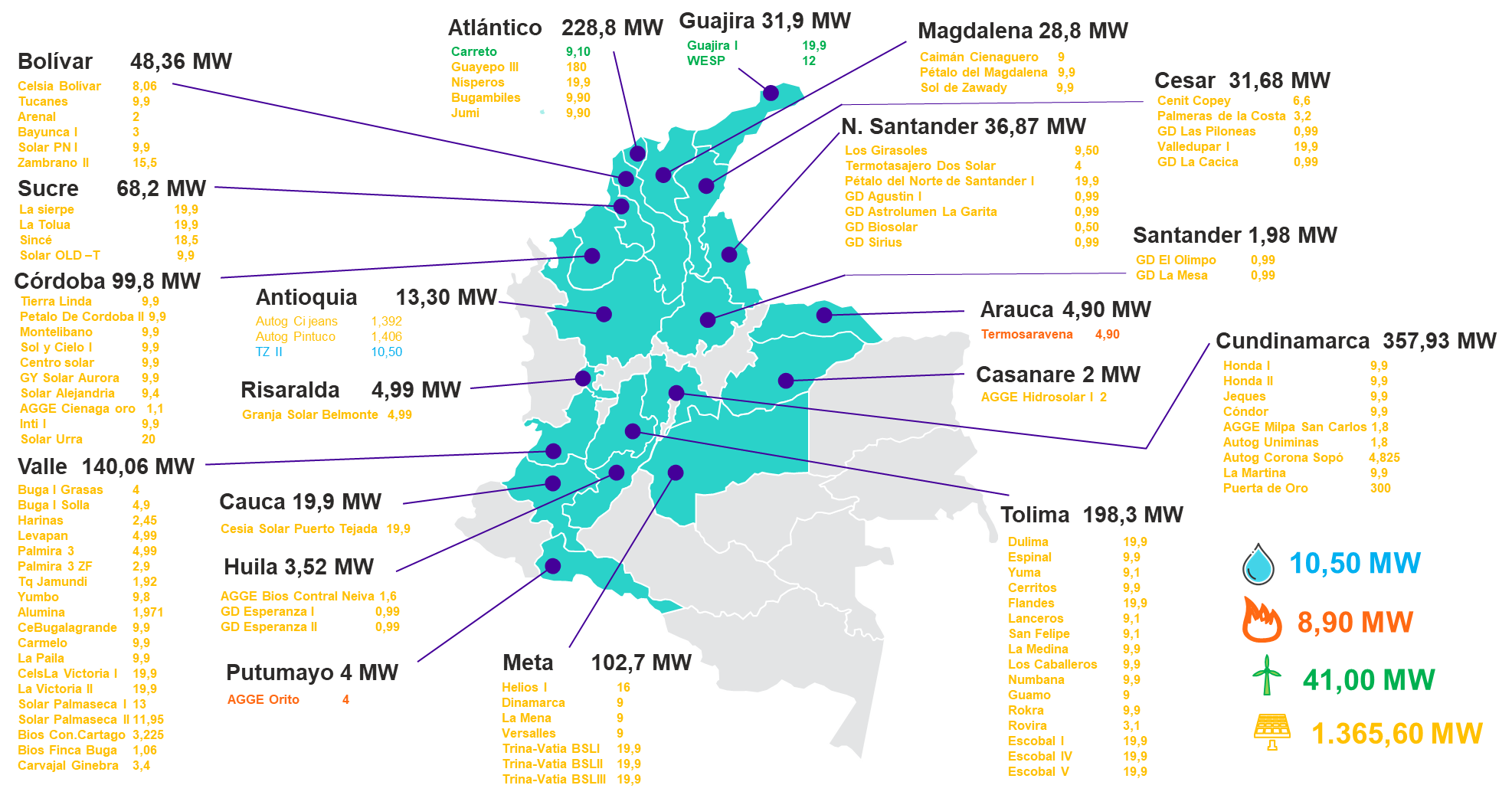 8 proyectos de generación de los cuales 2 son despachados centralmente, a continuación, se presenta el detalle de los proyectos: