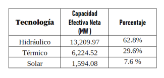 Durante el 2025 ingresaron a complementar la matriz de generación de energía eléctrica 380.26 MW de nuevas plantas, de estos 333.87 MW provienen de plantas solares fotovoltaicas; 5.30 MW de plantas hidráulicas y 41.09 MW corresponde a plantas térmicas. De esta manera, la capacidad total del Sistema Interconectado Nacional, SIN, a corte del 31 de diciembre de 2025 fue de 21,028.56 MW.
