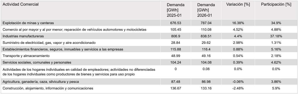 Dentro de las actividades económicas de mayor participación de demanda de energía en el mercado no regulado para enero de 2026 respecto a enero de 2025, se destacan: Industrias manufactureras con 838.51 GWh y Explotación de minas y canteras con 787.04 GWh, que representan un 37.18% y 34.9% de la demanda no regulada, respectivamente.