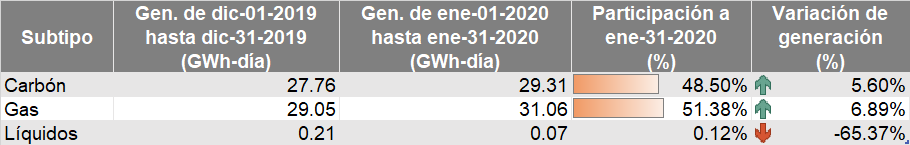 Por fuente de energía, el gas fue el mayor aportante con un 51.38%, equivalente a 31.06 GWh-día promedio (creciendo un 6.89% en relación con el mes anterior), seguido por el carbón con un 48.50%, equivalente a 29.31 GWh-día promedio (creciendo un 5.60% en relación con el mes anterior).